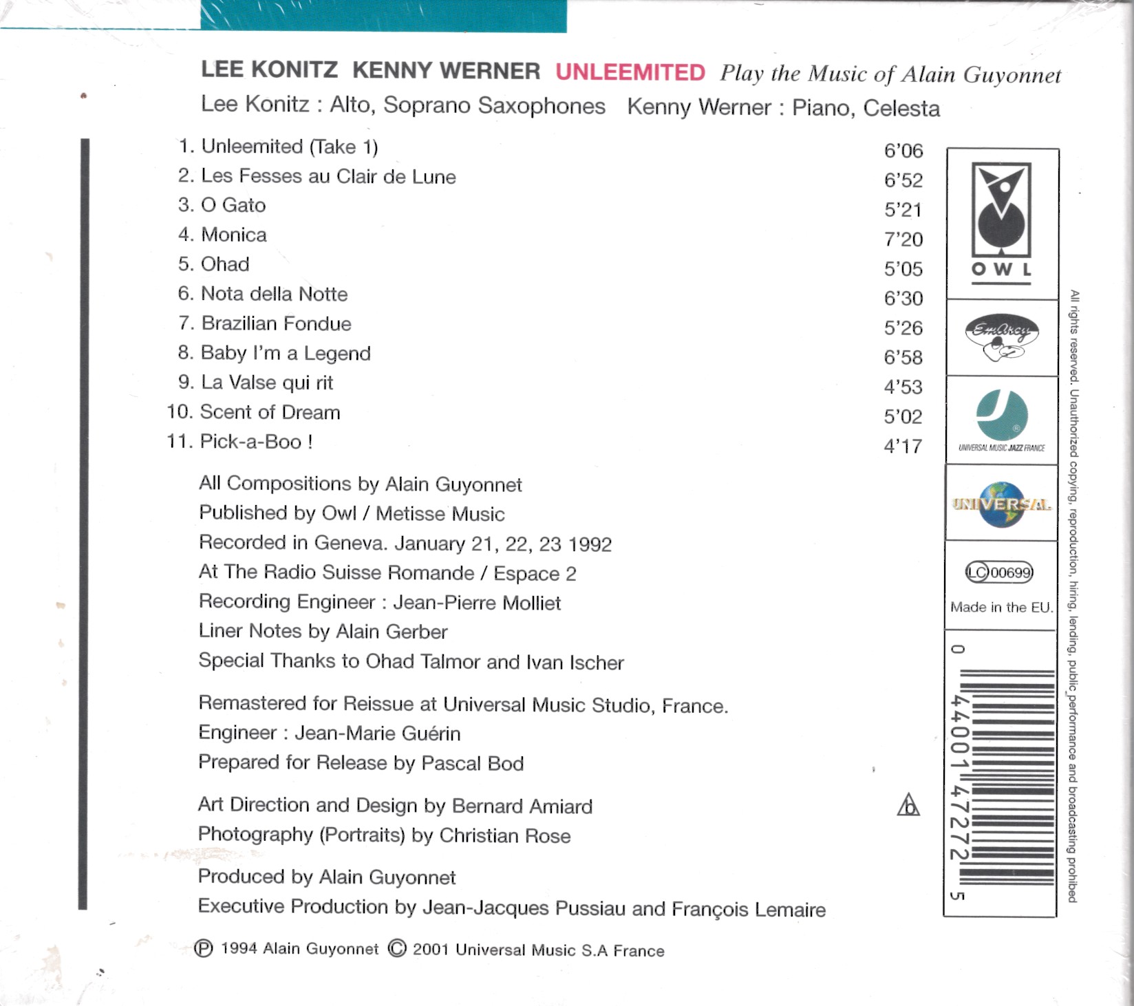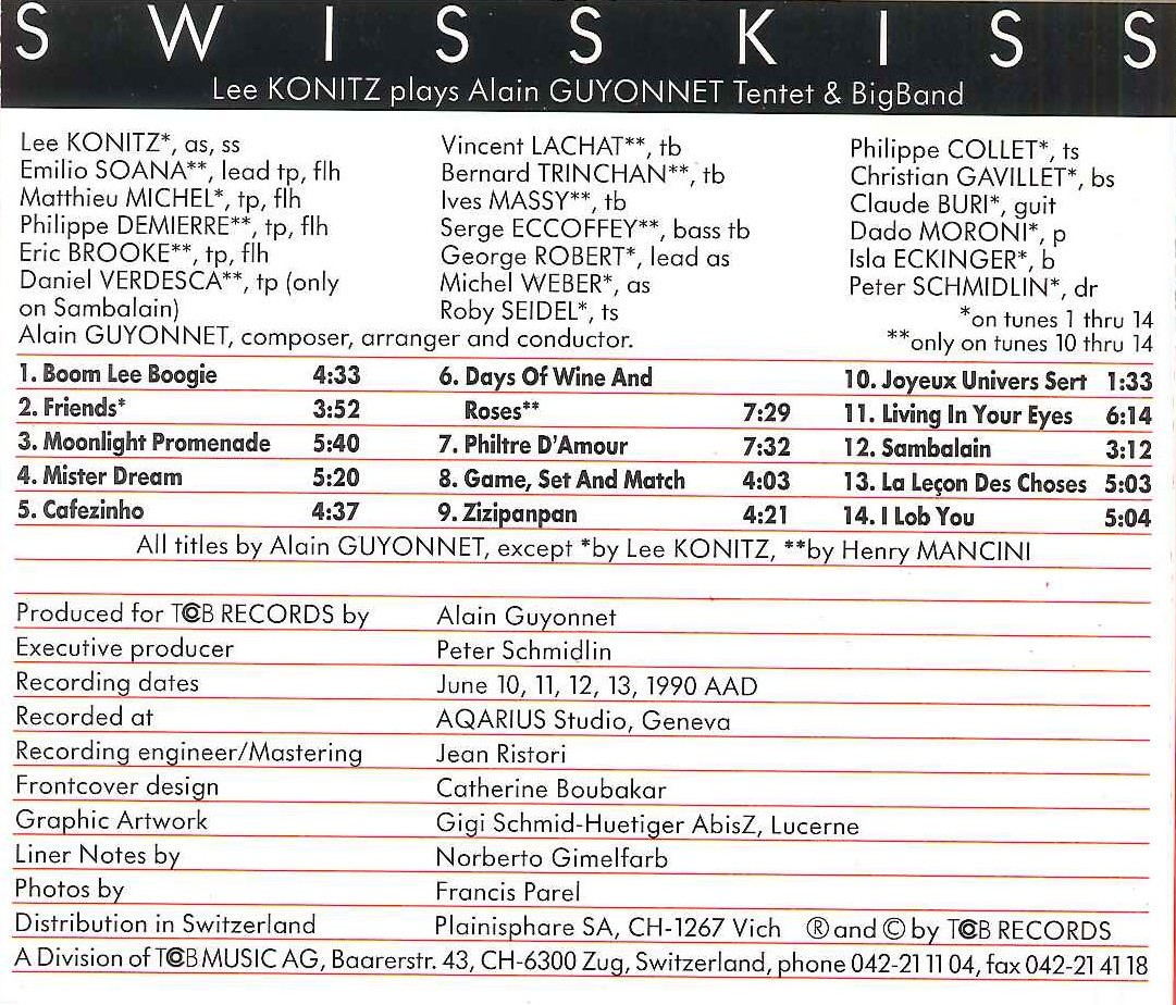 Alain Guyonnet Tentet and Big band, Featuring Lee Konitz, George Robert, Dado Moroni, Isla Eckinger, Perter Schmidlin